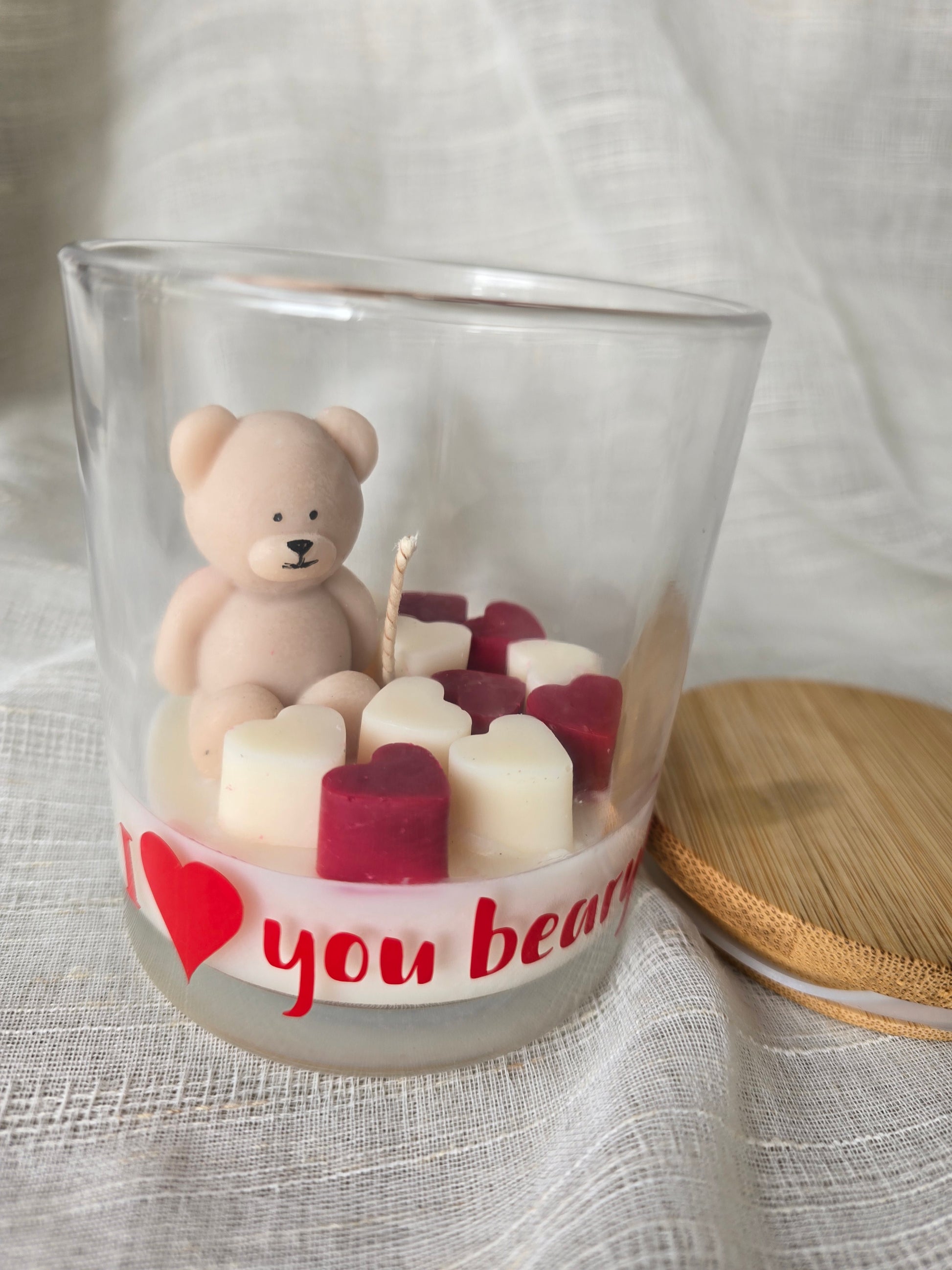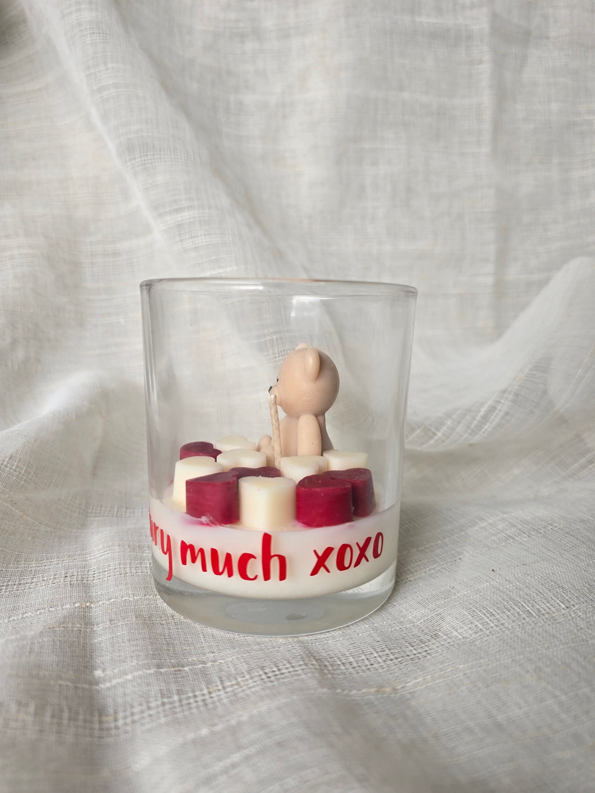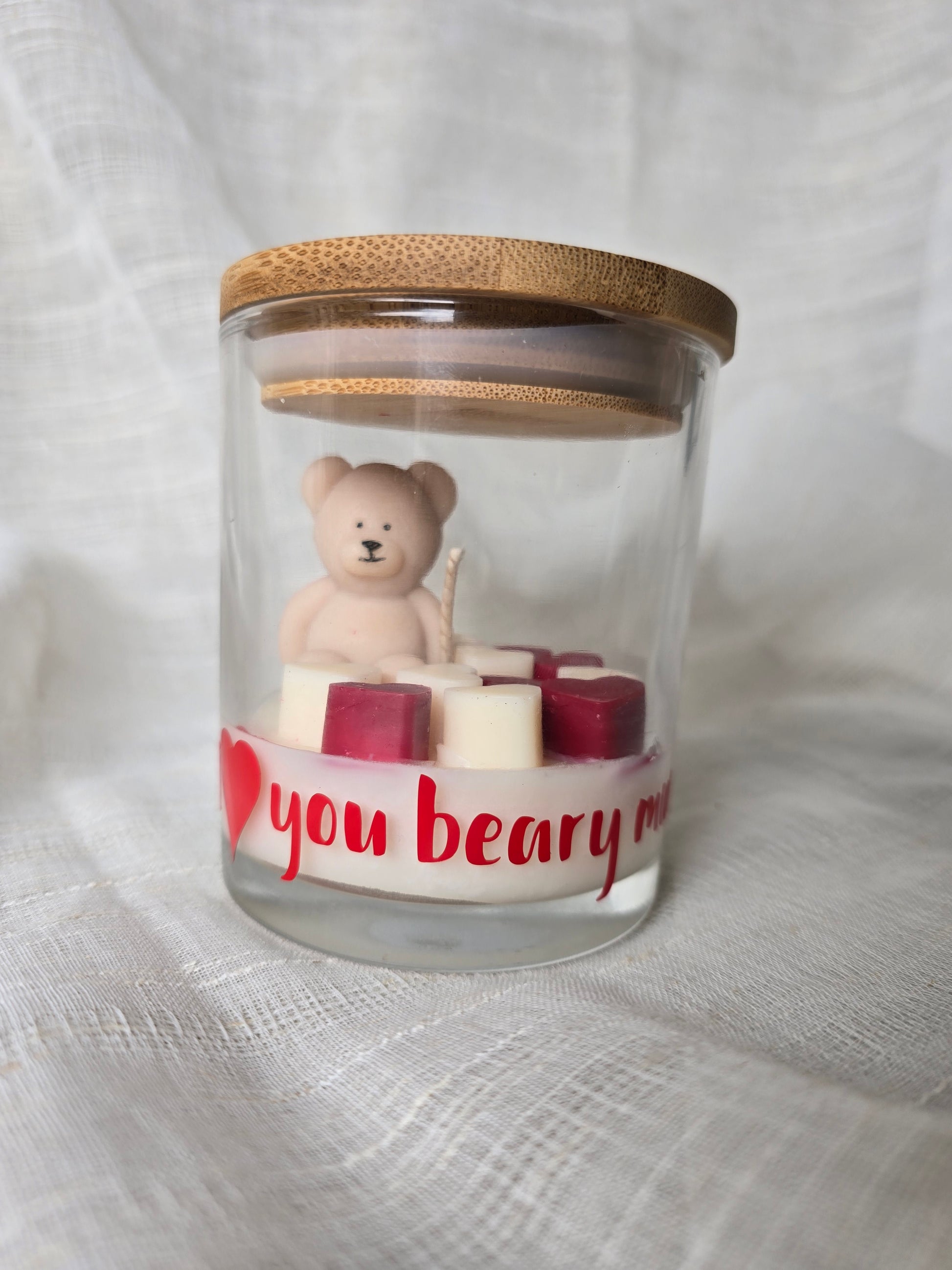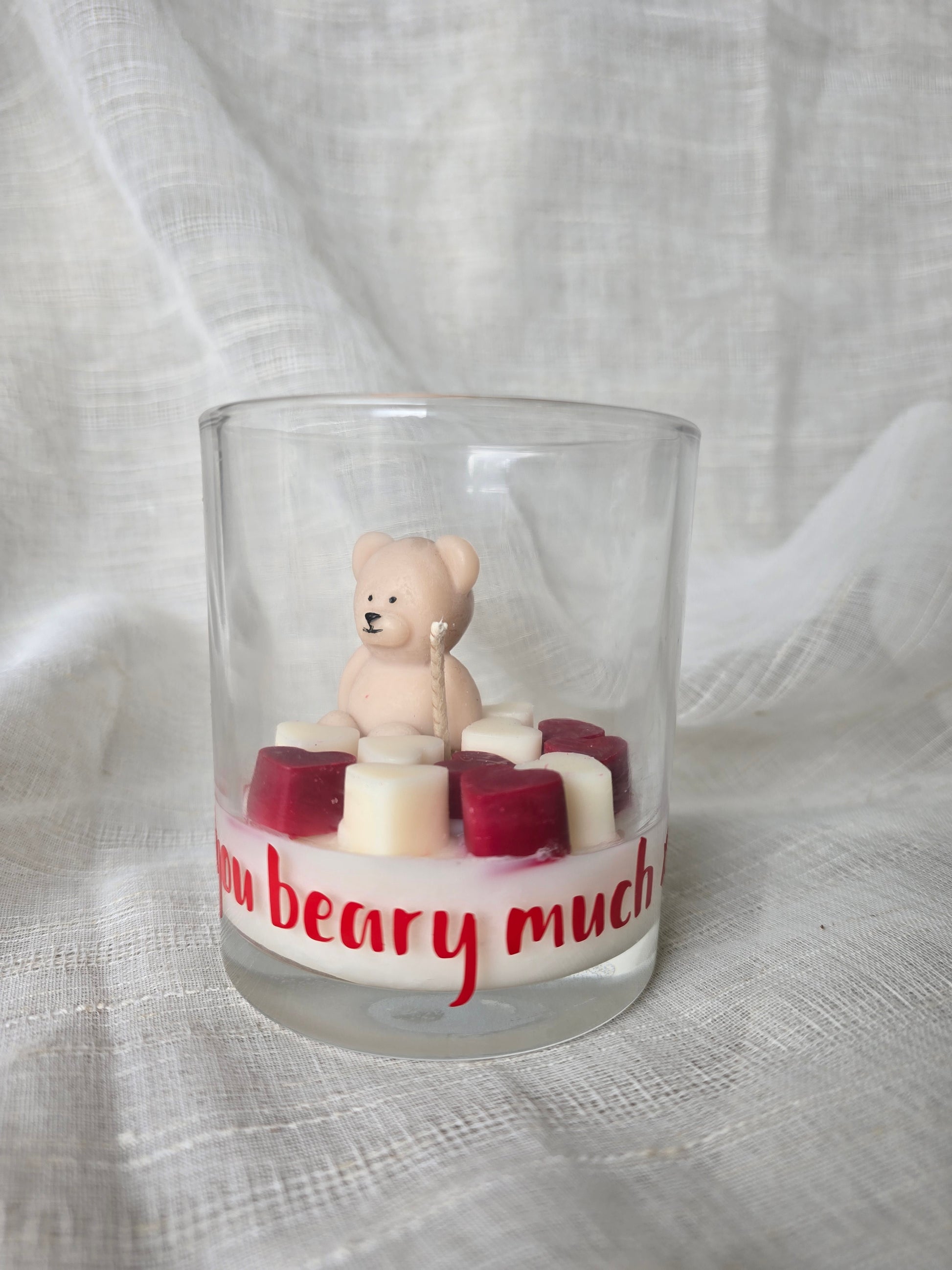 With approximately 160g of premium, hand-poured wax, this candle offers hours of a warm, comforting glow. The jar is beautifully adorned with the phrase "I ❤️ you beary much xoxo," adding a personal, romantic touch to the design.