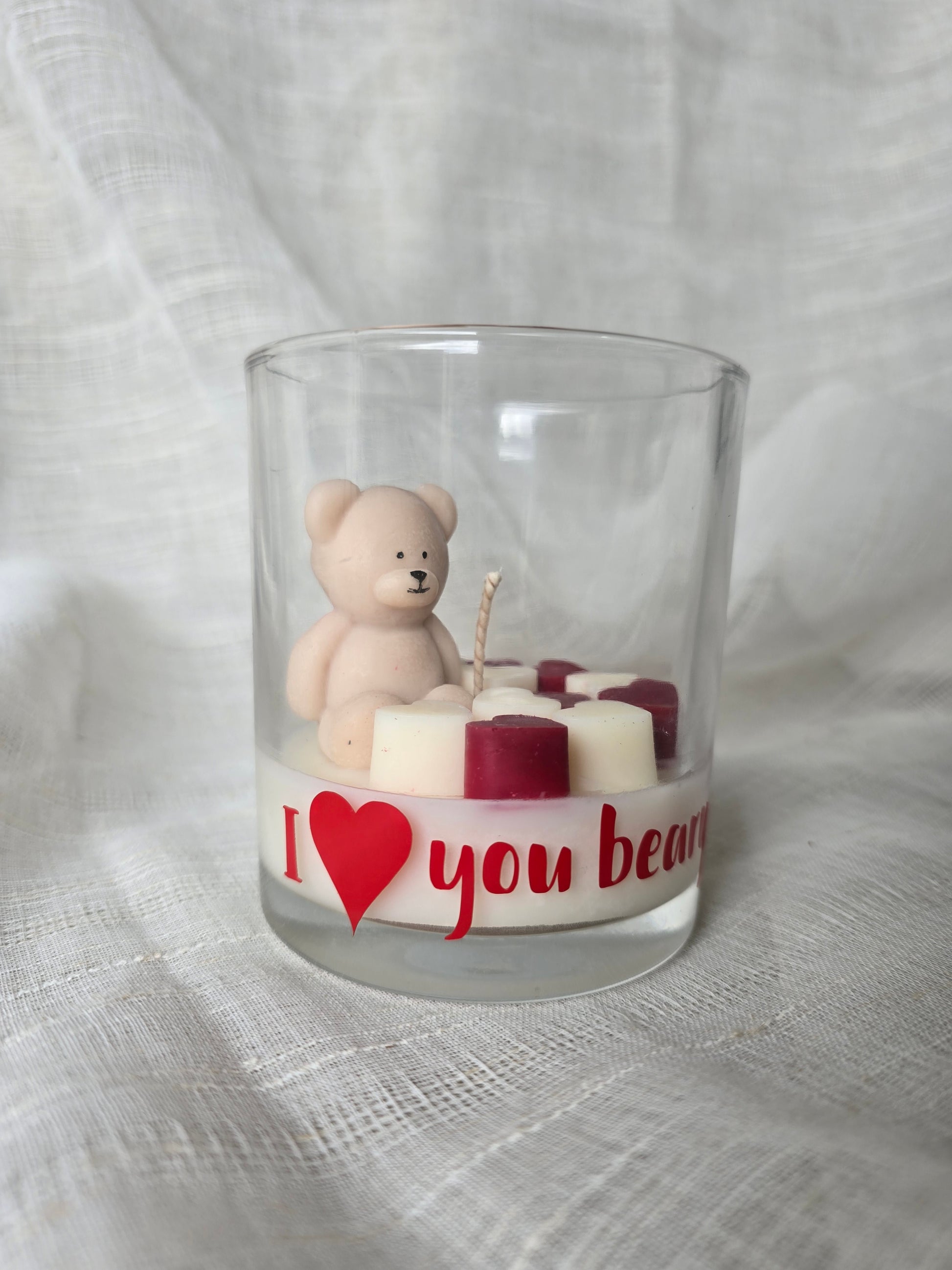 Show your love in the sweetest way with the I Love You Beary Much candle. This heartfelt creation features a mini wax teddy bear nestled among delicate red and white wax hearts, making it the perfect keepsake of affection.